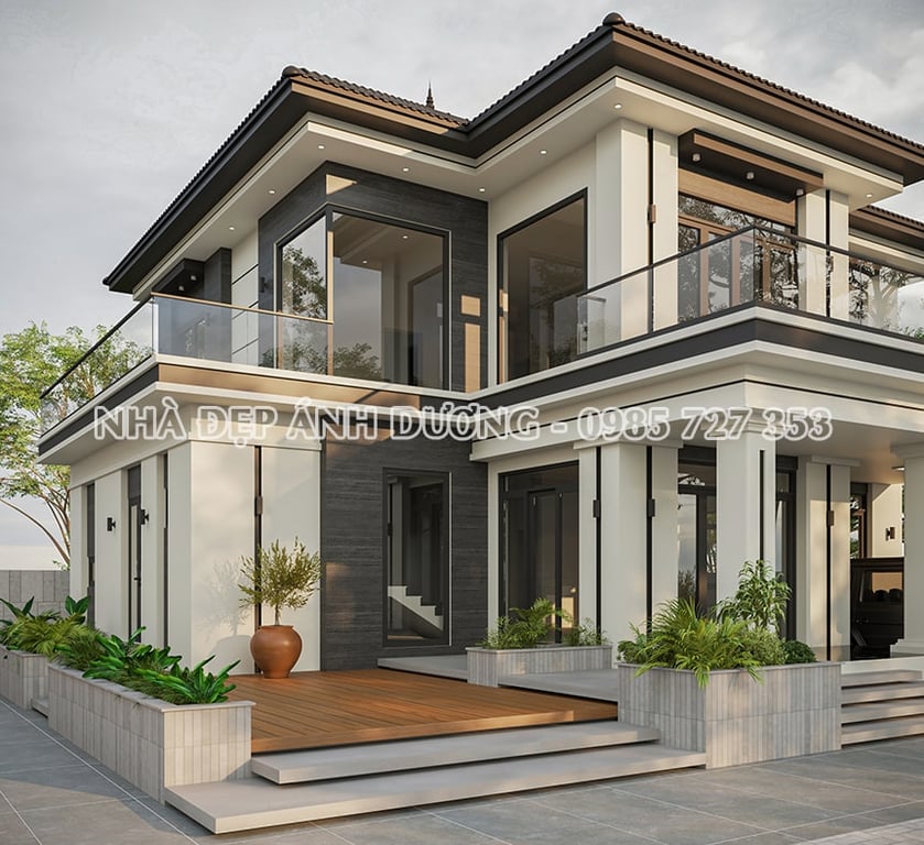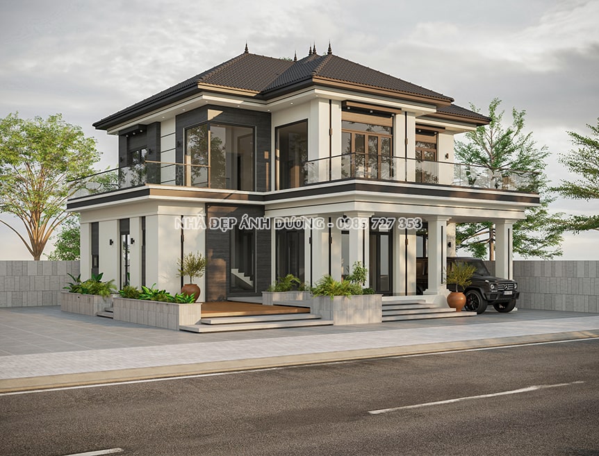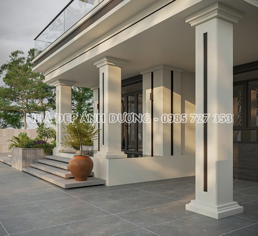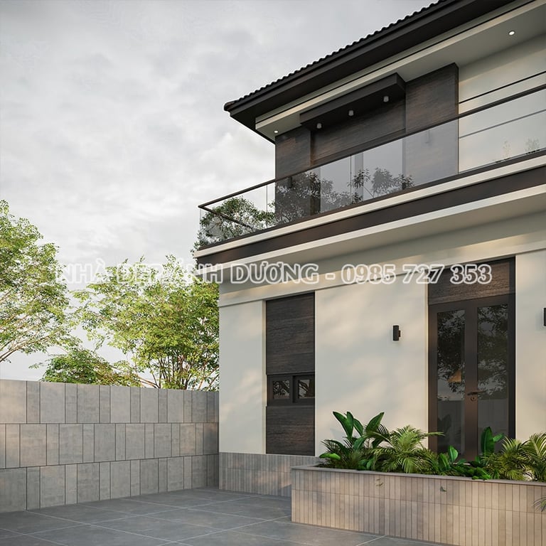 Tường rào bao quanh bảo vệ công trình, đồng thời tạo nên sự riêng tư và an ninh cho gia đình. Những đường nét đơn giản và tinh tế của tường rào tôn lên vẻ đẹp sang trọng và hiện đại của ngôi nhà.