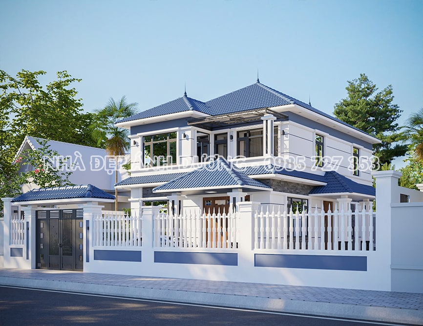 Tường rào bao quanh bảo vệ công trình, đồng thời tạo nên sự riêng tư và an ninh cho gia đình. Những đường nét đơn giản và tinh tế của tường rào tôn lên vẻ đẹp sang trọng và hiện đại của ngôi nhà.