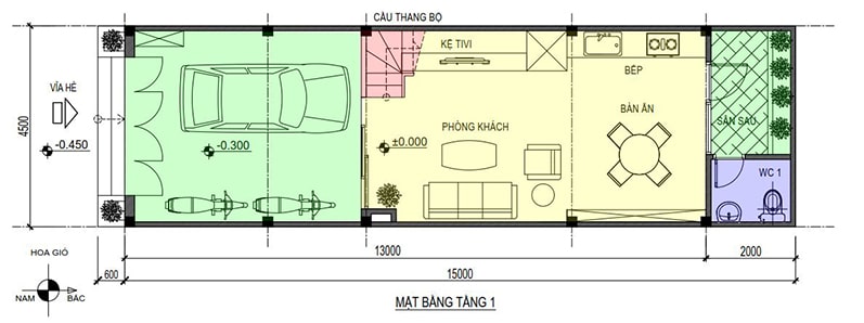 Tầng 1 gồm khu vực để xe ngay cửa, kết nối thẳng vào phòng khách thoáng rộng, tiếp giáp khu bếp + bàn ăn hiện đại. Phía cuối là sân sau và WC, tạo sự thông thoáng tự nhiên, tránh bí bách cho toàn bộ tầng.