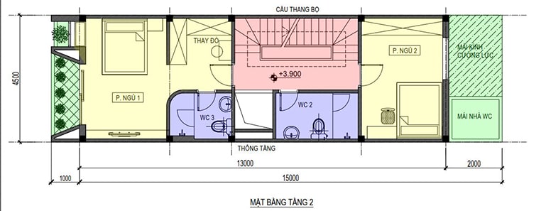 Tầng 2 bố trí 2 phòng ngủ rộng rãi (có phòng thay đồ riêng), kèm theo 2 WC tiện lợi. Ban công và khoảng thông tầng giúp ánh sáng và gió trời luôn tràn ngập.