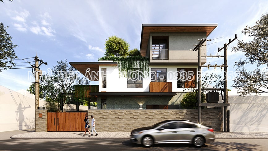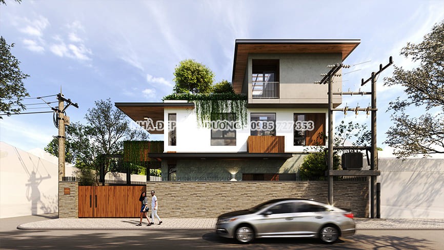 Tường rào bao quanh bảo vệ công trình, đồng thời tạo nên sự riêng tư và an ninh cho gia đình. Những đường nét đơn giản và tinh tế của tường rào tôn lên vẻ đẹp sang trọng và hiện đại của ngôi nhà.