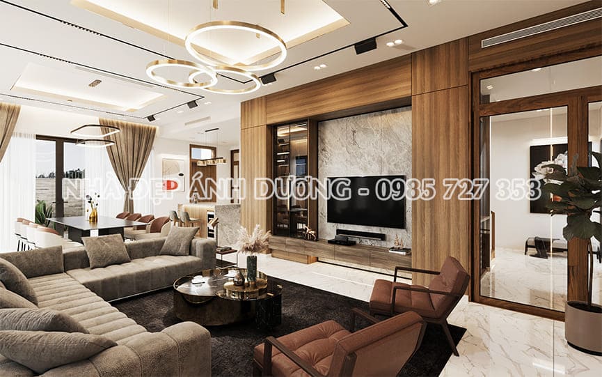 Tông màu chủ đạo của ngôi nhà là màu xám, tạo nên sự sang trọng và hiện đại, pha trộn hài hòa với màu xanh của cây cỏ. Các mảng trần ốp giả gỗ kết hợp với đèn âm trần tạo nên không gian ấm áp và đậm chất thiên nhiên.