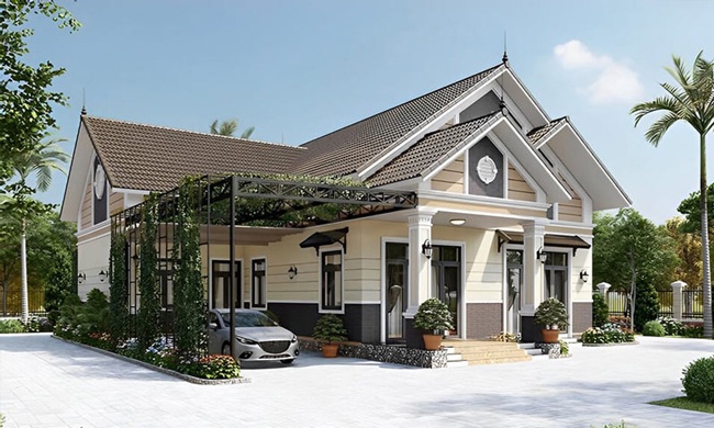 Nhà cấp 4 giả mái Thái là lựa chọn tiết kiệm chi phí nhưng vẫn giữ được nét đẹp của kiến trúc mái Thái. Với thiết kế này, phần mái chính thường được làm phẳng hoặc có độ dốc nhẹ, sau đó được gắn thêm các chi tiết giả mái Thái để tạo điểm nhấn. Điều này giúp ngôi nhà trông vẫn thanh lịch, sang trọng mà không cần đầu tư quá nhiều vào vật liệu xây dựng. Đây là giải pháp phù hợp cho những gia đình có ngân sách hạn chế nhưng vẫn mong muốn sở hữu một ngôi nhà đẹp.