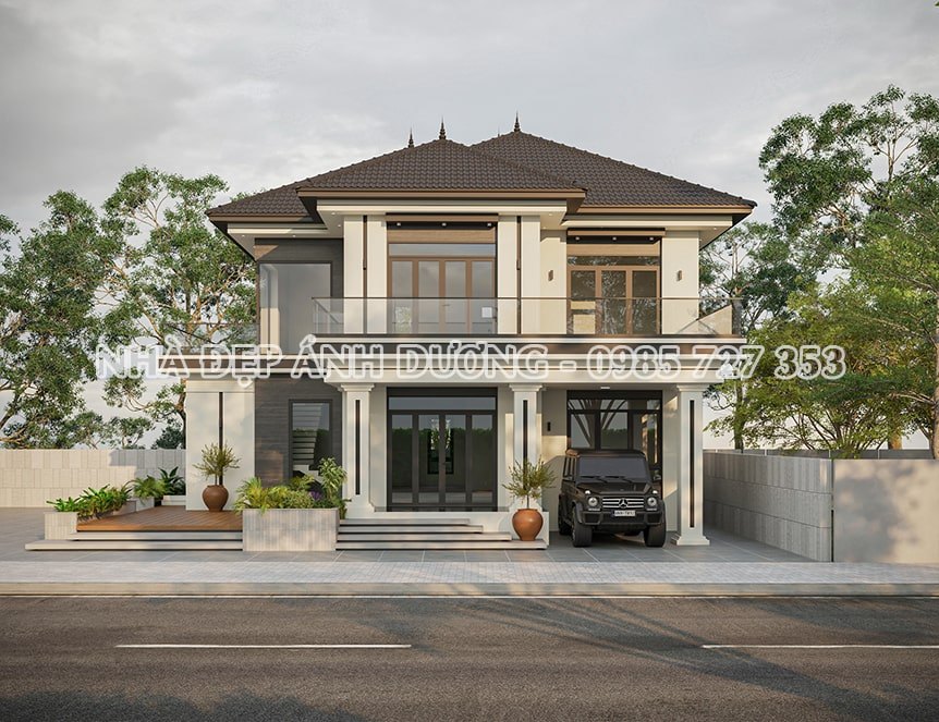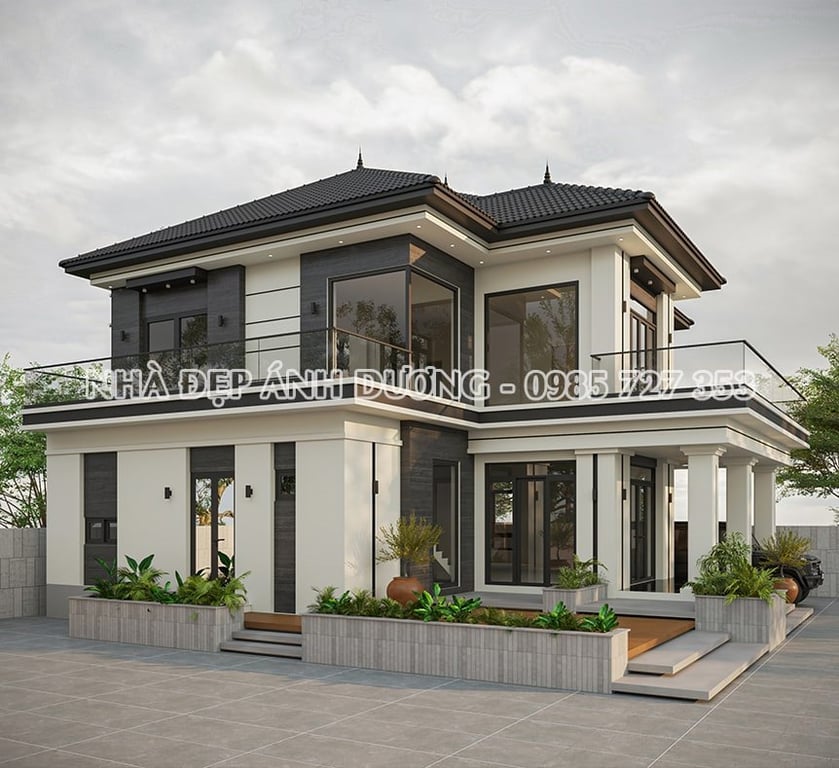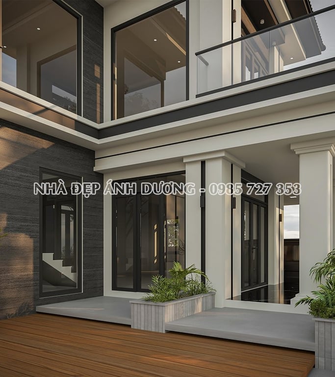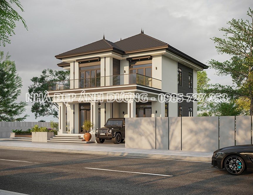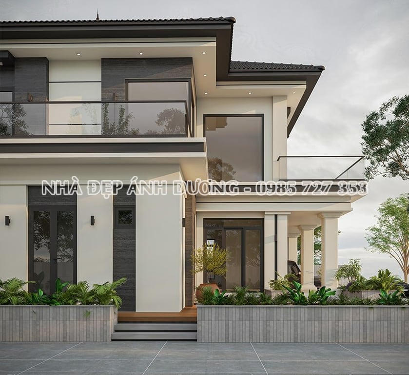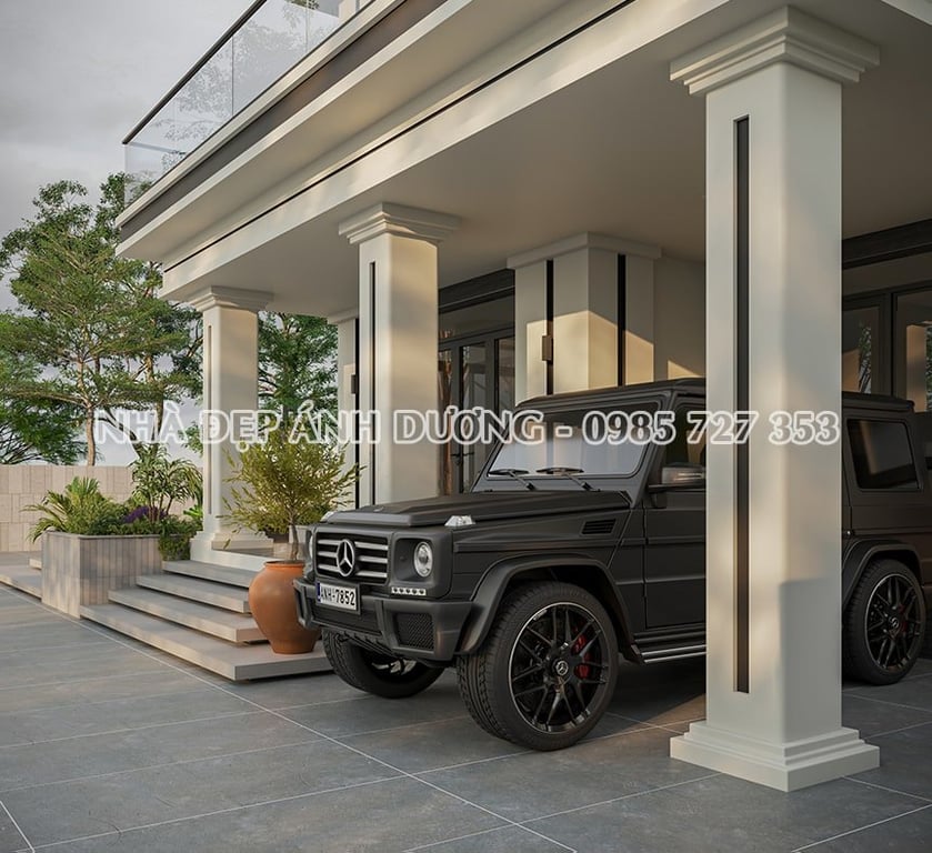 Tường rào bao quanh bảo vệ công trình, đồng thời tạo nên sự riêng tư và an ninh cho gia đình. Những đường nét đơn giản và tinh tế của tường rào tôn lên vẻ đẹp sang trọng và hiện đại của ngôi nhà.