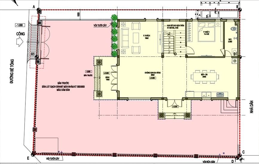 Với diện tích chiều ngang 6m và chiều sâu 17m, Kisato đã tận dụng không gian một cách hiệu quả để tạo ra một mặt bằng công năng hoàn hảo cho ngôi nhà ống ba tầng hiện đại này. Tại tầng 1, bạn sẽ tìm thấy một sân trước rộng rãi, mang lại không gian ngoài trời thư giãn và giao lưu. Gara để xe được thiết kế tiện lợi, giúp bảo vệ phương tiện của gia đình anh Đinh Duy Khánh. Cùng với đó, có một phòng ngủ tiện nghi và một vệ sinh chung thuận tiện cho việc sử dụng chung. Điểm nhấn tại tầng này là sân ướt, tạo điểm xanh và gió mát cho không gian.