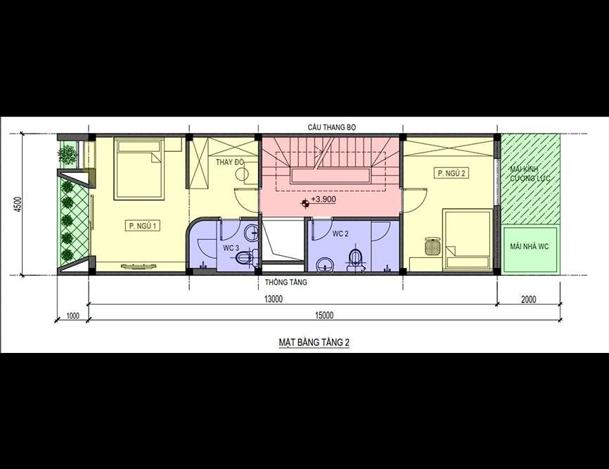 Tầng 2 bố trí 2 phòng ngủ rộng rãi (có phòng thay đồ riêng), kèm theo 2 WC tiện lợi. Ban công và khoảng thông tầng giúp ánh sáng và gió trời luôn tràn ngập.