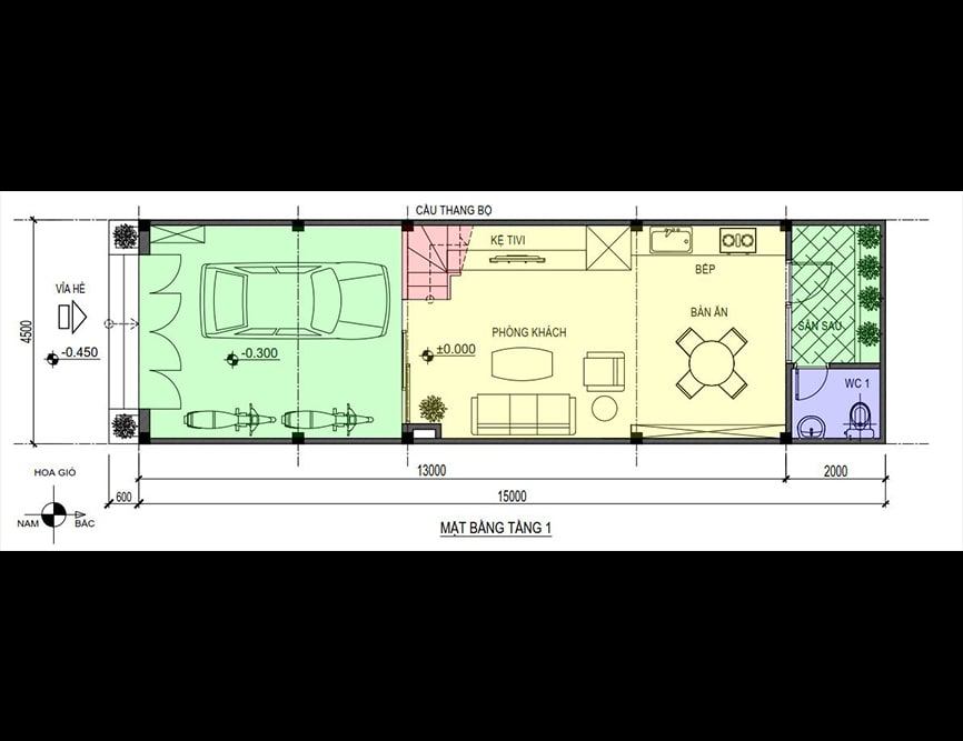 Tầng 1 gồm khu vực để xe ngay cửa, kết nối thẳng vào phòng khách thoáng rộng, tiếp giáp khu bếp + bàn ăn hiện đại. Phía cuối là sân sau và WC, tạo sự thông thoáng tự nhiên, tránh bí bách cho toàn bộ tầng.