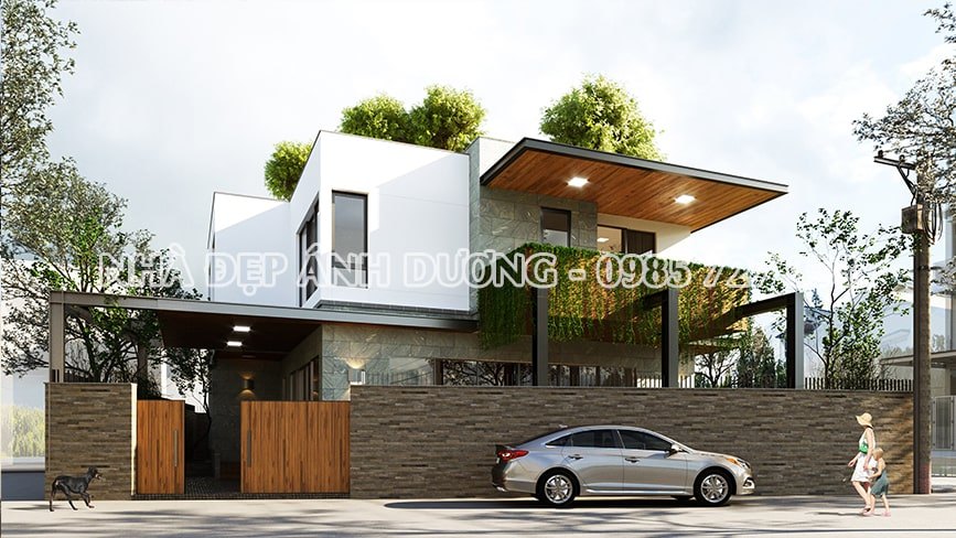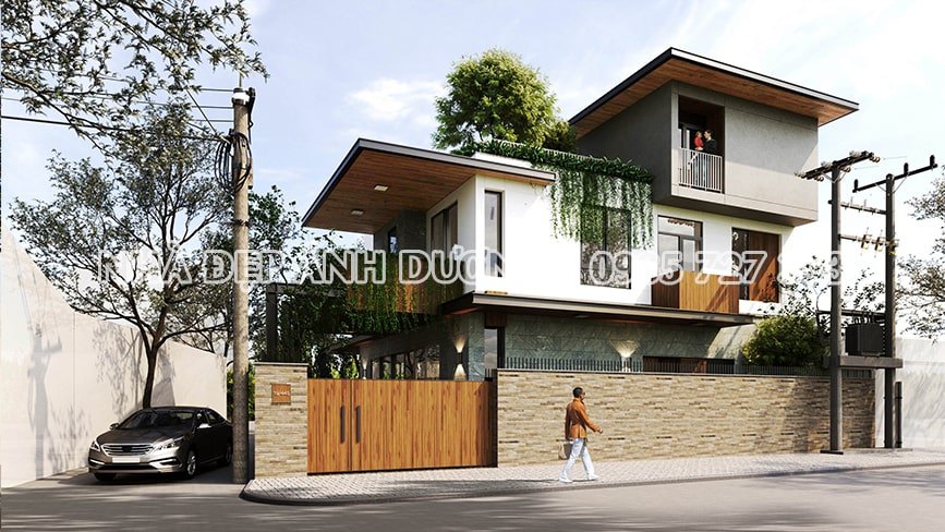 Tường rào bao quanh bảo vệ công trình, đồng thời tạo nên sự riêng tư và an ninh cho gia đình. Những đường nét đơn giản và tinh tế của tường rào tôn lên vẻ đẹp sang trọng và hiện đại của ngôi nhà.