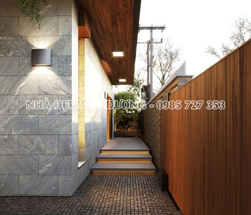 Tông màu chủ đạo của ngôi nhà là màu xám, tạo nên sự sang trọng và hiện đại, pha trộn hài hòa với màu xanh của cây cỏ. Các mảng trần ốp giả gỗ kết hợp với đèn âm trần tạo nên không gian ấm áp và đậm chất thiên nhiên.