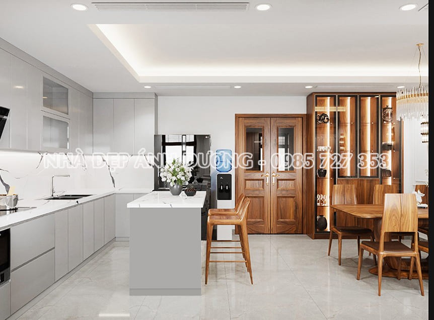Tông màu chủ đạo của ngôi nhà là màu xám, tạo nên sự sang trọng và hiện đại, pha trộn hài hòa với màu xanh của cây cỏ. Các mảng trần ốp giả gỗ kết hợp với đèn âm trần tạo nên không gian ấm áp và đậm chất thiên nhiên.